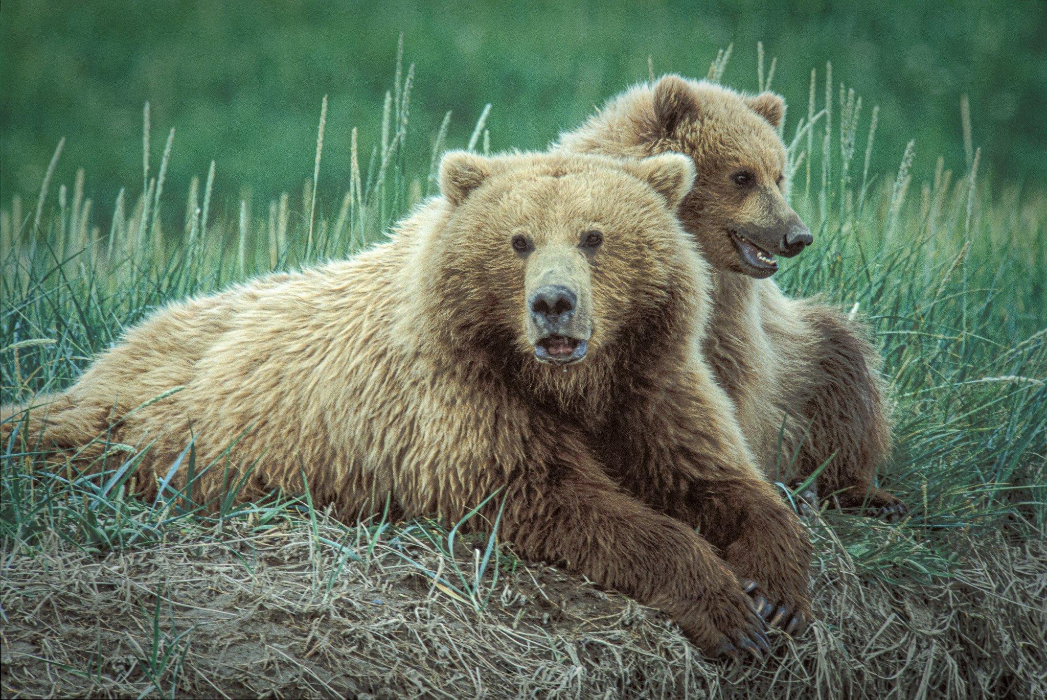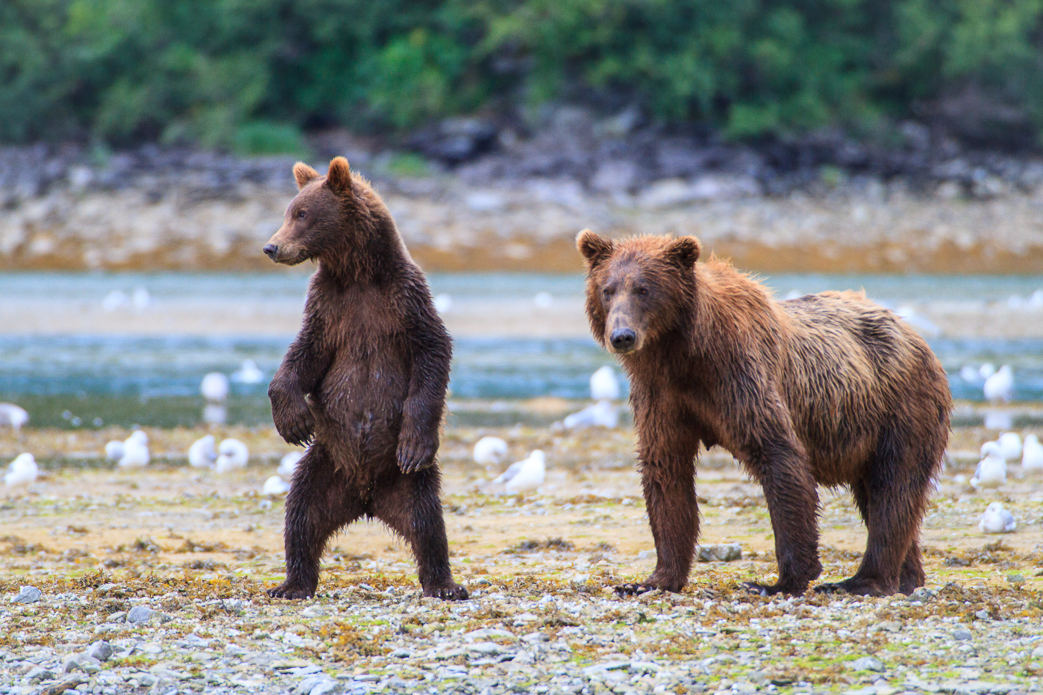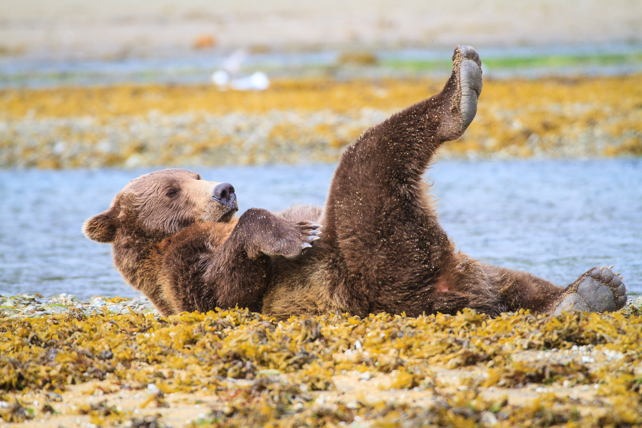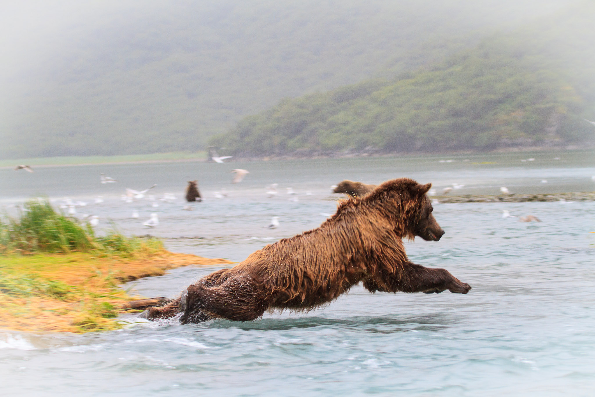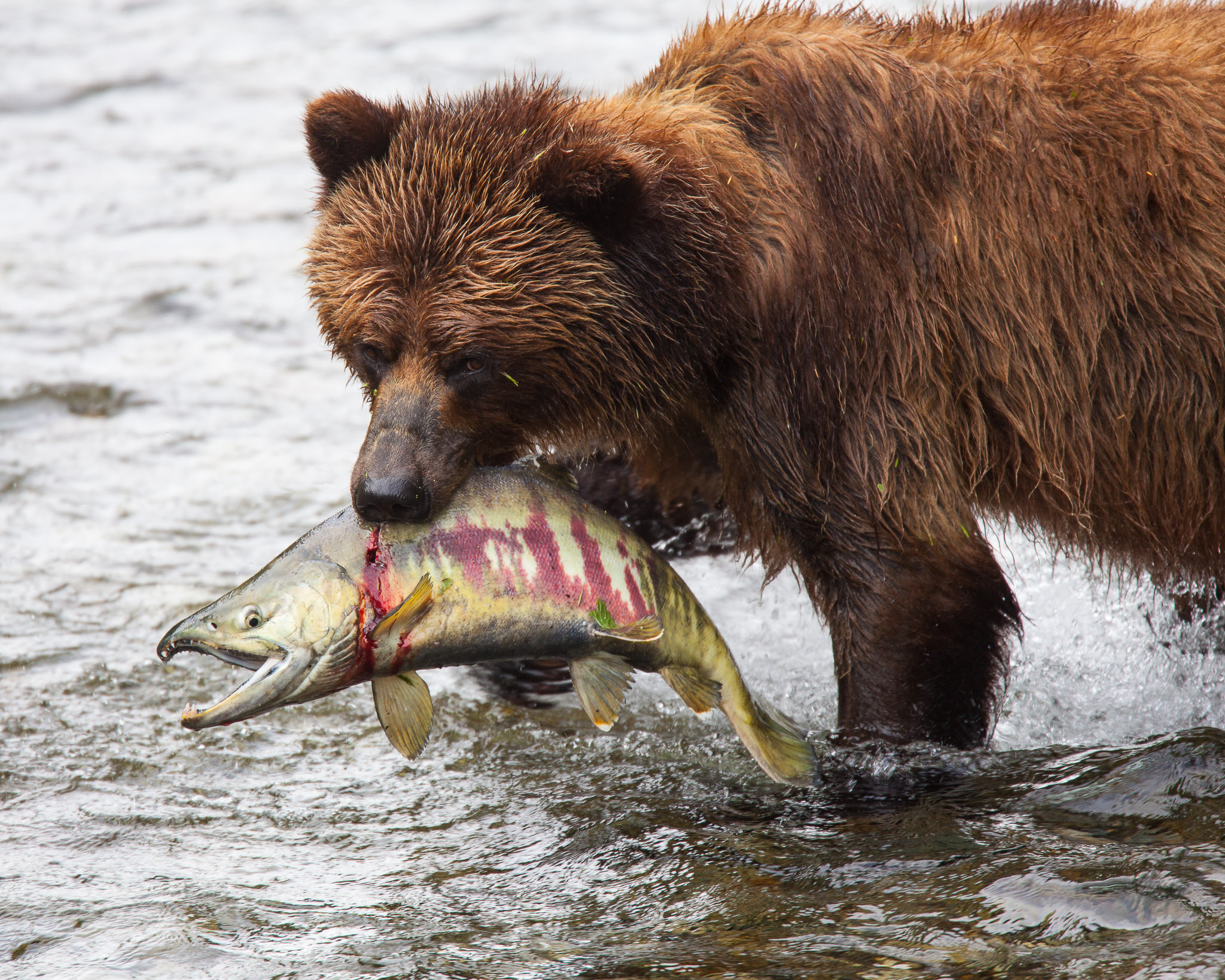 There are several recognized subspecies within the brown bear species. In North America, two types are generally recognized, the coastal brown bear and the inland grizzly, and the two types could broadly define all brown bear subspecies. Grizzlies weigh as little as 350 lb (159 kg) in Yukon, while a brown bear, living on a steady, nutritious diet of spawning salmon, from Coastal Alaska and Russia can weigh 1500 lb (682 kg). The exact number of overall brown subspecies remains in debate.